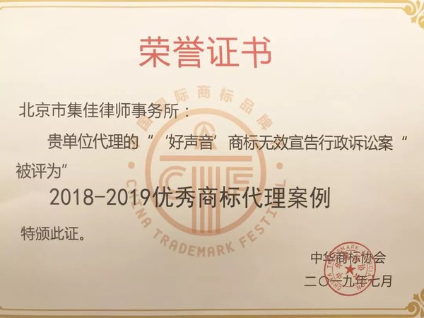 >c7娱乐>关于我们>荣誉概览>2019>集佳代理“好声音”商标无效宣告行政案入选“优秀商标代理案例”