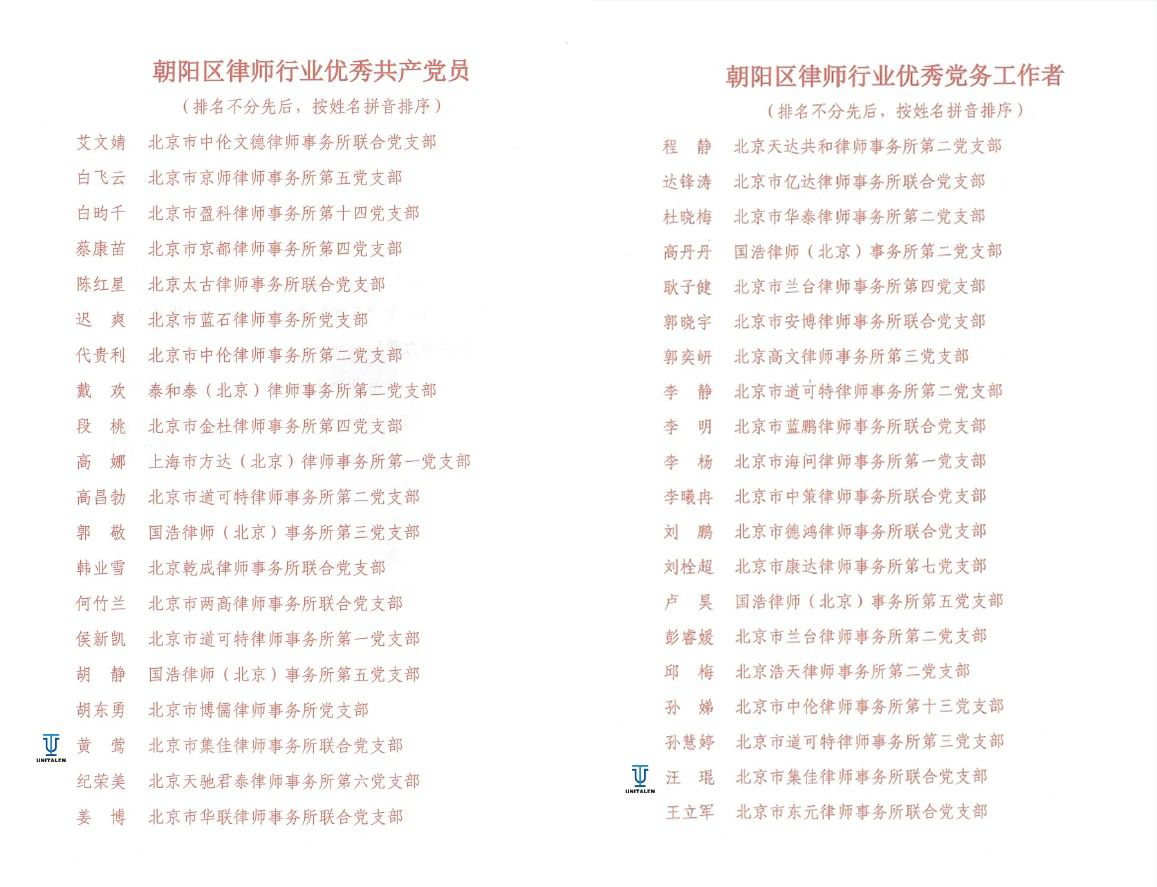 6月27日,朝阳区律师行业党委召开了朝阳区律师行业庆祝中国共产党成立104周年暨总结表彰大会,c7娱乐联合党支部党员黄莺荣获“朝阳区律师行业优秀共产党员”称号,支部党员汪琨荣获“朝阳区律师行业优秀党务工作者”称号。